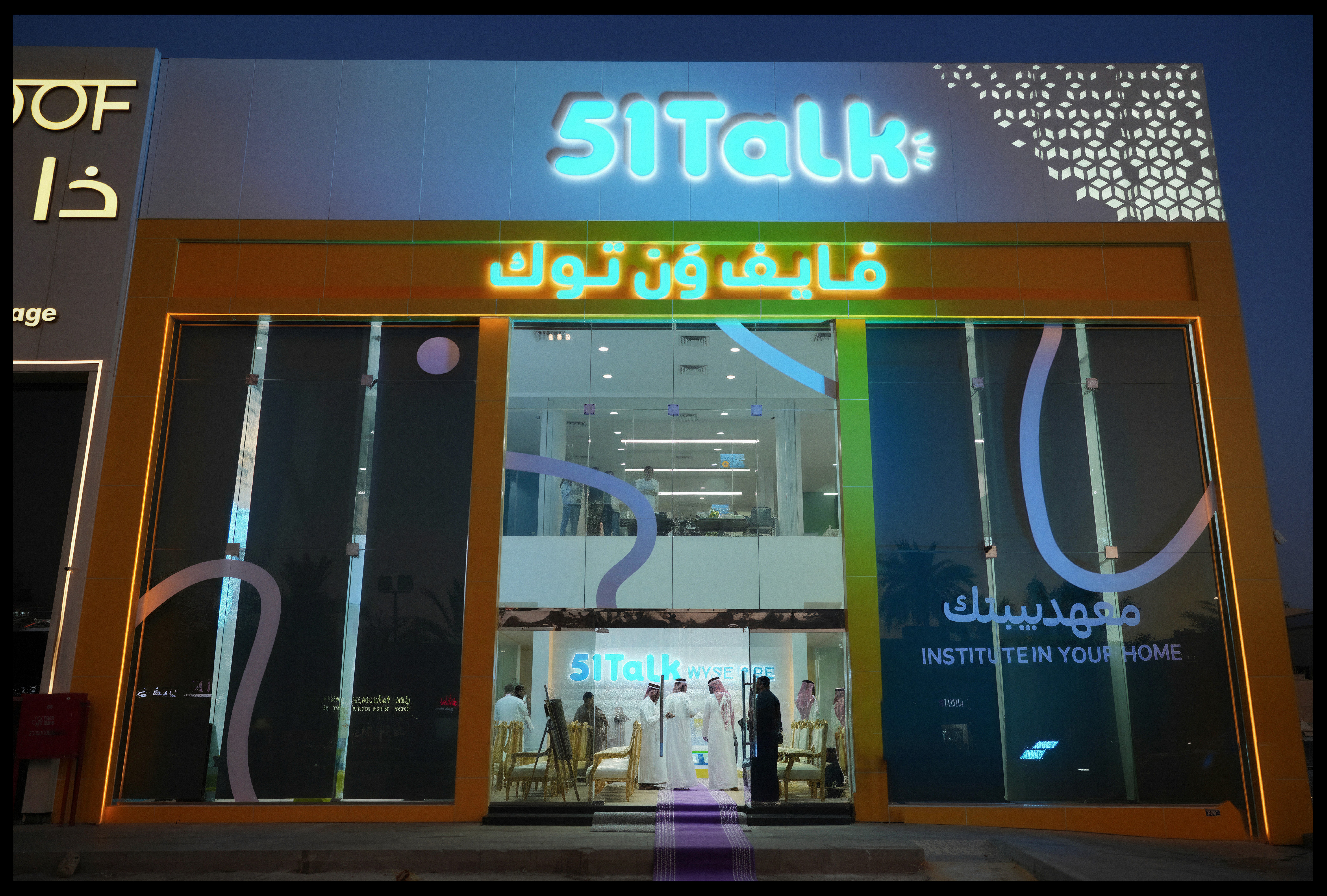 اعتمدت 51Talk شعار الحملة «معهد ببيتك» كشعار لها واستخدموه على واجهة مبناهم في الرياض: